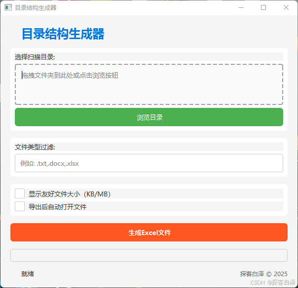 随着文件和目录管理的复杂性不断增加,尤其是在处理大量项目文件和文件夹时,手动管理和查看目录结构变得越来越繁琐。在这个背景下,我们开发了一款 目录结构生成器,它不仅能够帮助用户高效地生成文件夹目录结构,还具备了很多智能化的功能,如文件大小格式化、Excel 导出、拖拽操作以及动态进度条等,极大提升了文件管理的效率。