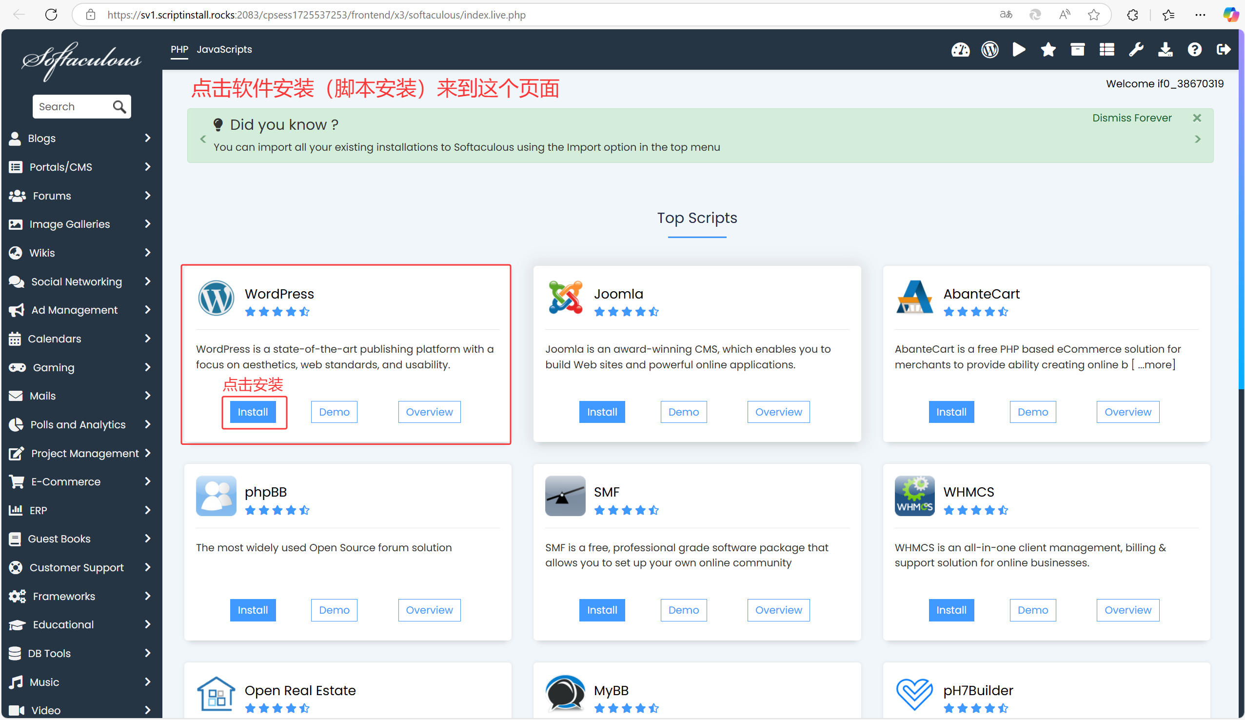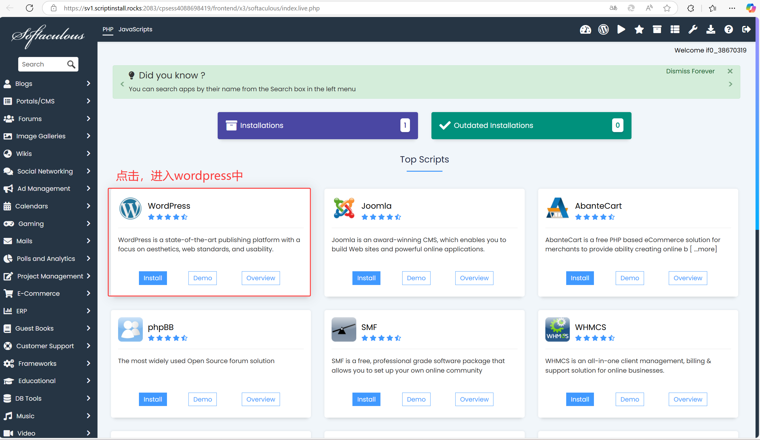 1.点击Script Installer,进入程序选择页面,点击wordpress的安装