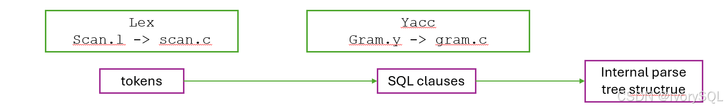 PostgreSQL 的解析器使用 lex(Flex 词法分析器)和 yacc(Bison 解析器)工具创建。这些工具通过正则表达式定义文件生成对应的 C 语言源代码结构,生成的源文件位于 src/backend/parser 目录下,并在编译 PostgreSQL 时通过 make 自动生成。