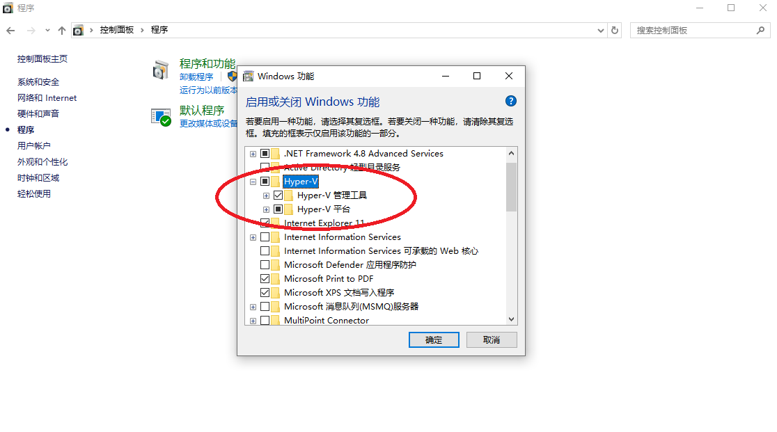 然后依次勾选<<Hyper-V>>,<<Windows虚拟机监控程序平台>>,<<容器>>,<<适用于Linux的Windows子系统>>,<<虚拟机平台>>