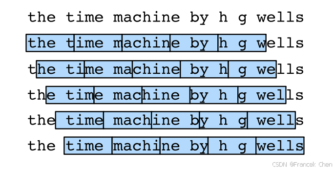 首先,由于文本序列可以是任意长的,例如整本《时光机器》(The Time Machine),于是任意长的序列可以被我们划分为具有相同时间步数的子序列。当训练我们的神经网络时,这样的小批量子序列将被输入到模型中。假设网络一次只处理具有 n n n个时间步的子序列。图1画出了从原始文本序列获得子序列的所有不同的方式,其中 n = 5 n=5 n=5,并且每个时间步的词元对应于一个字符。请注意,因为我们可以选择任意偏移量来指示初始位置,所以我们有相当大的自由度。