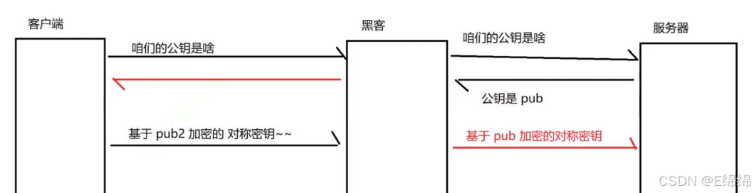 这时就到了关键环节:黑客可以自己生成出一对公钥(pub2)和私钥(pri2),黑客就会把自己的公钥(pub2)返回给客户端,客户端就无法区分出当前的pub2是不是服务器最开始返回的公钥,是不是被中间人掉包了的公钥,客户端就只能选择相信,客户端就会拿着pub2针对对称密钥进行加密,并且发送给服务器(黑客),此时黑客就会拿着pir2针对刚才收到的pub2加密的数据进行解密,从而拿到这里的对称密钥,黑客继续把拿到的对称密钥,使用服务器的公钥pub再次加密发送给服务器,服务器就会使用自己的私钥进行解密,此处肯定会解密成功,拿到对称密钥,接下里意味着客户端和服务器就会继续使用这个对称密钥来完成后续的业务数据加密,此时对称密钥已经泄露出去了
