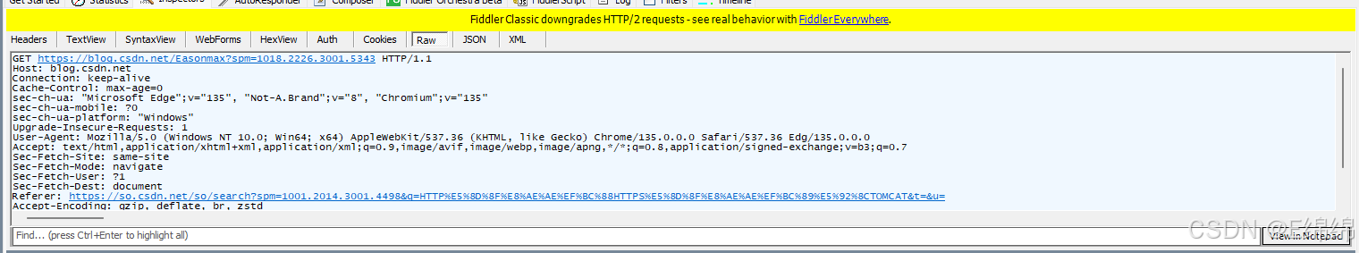 学习一个协议我们肯定要知道它的格式,HTTP协议格式跟其他协议不同,它的请求报文格式和响应报文格式是不同的,我们可以通过刚学的Fiddler去抓包看下请求和响应的内容。