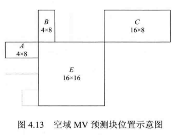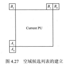 空域MV候选列表的建立如图4.27所示,图中A1表示当前PU左侧最下方的PU,B1表示当前PU上方最右侧的PU,B0和A0分别表示当前PU右上方和左下方距离最近的PU,B2表示当前PU左上方距离最近的PU。H.265/HEVC标准规定,空域最多提供4个候选MV,即最多使用上述5个候选块中4个候选块的运动信息,列表按照A1→B1→B0→A0→(B2)的顺序建立,其中B为替补,即当A1,B1,B0,A0中有一个或多个不存在时,则需要使用B2的运动信息。