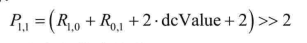 - DC模式(DC Mode2),当前块预测像素都为其所有参考像素的平均值,计算如下: