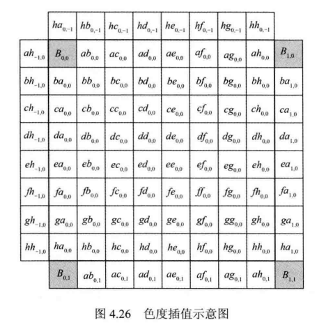 为整像素点,其余都为亚像素点。标准规定色度亚像素插值使用基于离散余弦变换的4抽头滤波器,具体见表4.6.
