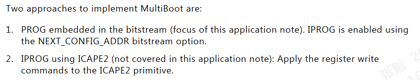 1,有两种方式可是实现multiboot跳转,一种是通过TCL指令直接把IPROG跳转指令固化到固件(bitstream)里,一种是加入ICAPE2原语,通过写代码实时打IPROG跳转指令。