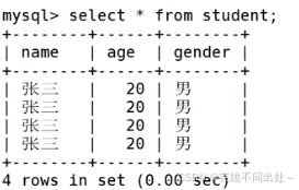insert into student(name,age,gender) values(‘张三’,20,‘男’);