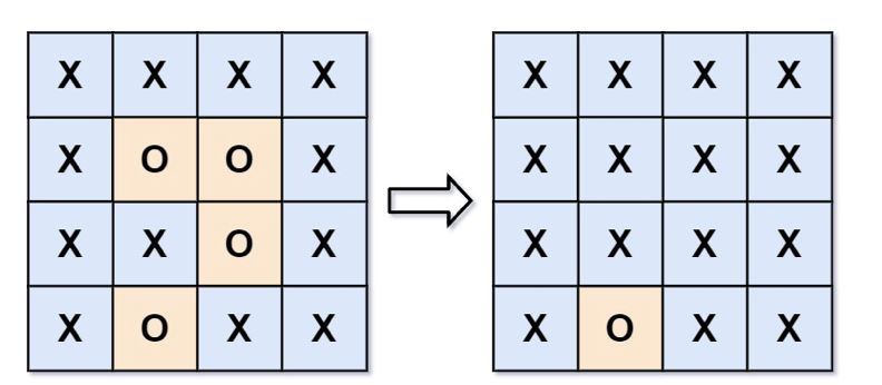 围绕:如果您可以用 ‘X’ 单元格 连接这个区域,并且区域中没有任何单元格位于 board 边缘,则该区域被 ‘X’ 单元格围绕。