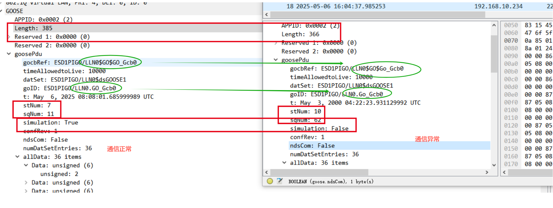 实际工程中,若gocbRef或goID大小写不匹配,可能触发LGOS逻辑节点的订阅失败告警(如stVal置为false)。例如,某智能终端配置goID为"GOID_1",而保护装置订阅的goID为"Goid_1",将导致 GOOSE 链路中断,需通过 Station Scout 等工具校验配置一致性。 见下图所示:未使用到工具链,因大小写不一致造成无法正常通讯。