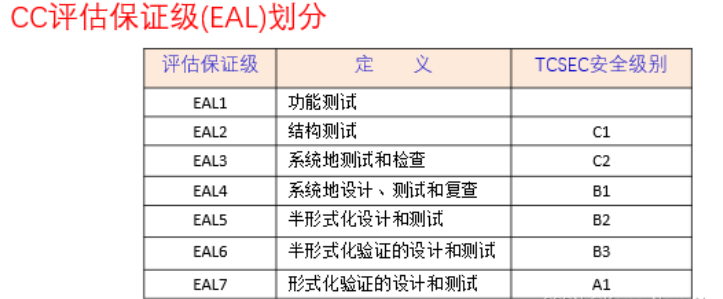 评估保证级 特点 对应TCSEC级别 EAL1 仅进行功能测试 无对应(安全性较低) EAL2 进行结构测试 C1级 EAL3 系统地测试和检查 C2级 EAL4 系统地设计、测试和复查 B1级 EAL5 半形式化设计和测试 B2级 EAL6 半形式化验证的设计和测试 B3级 EAL7 形式化验证的设计和测试 A1级