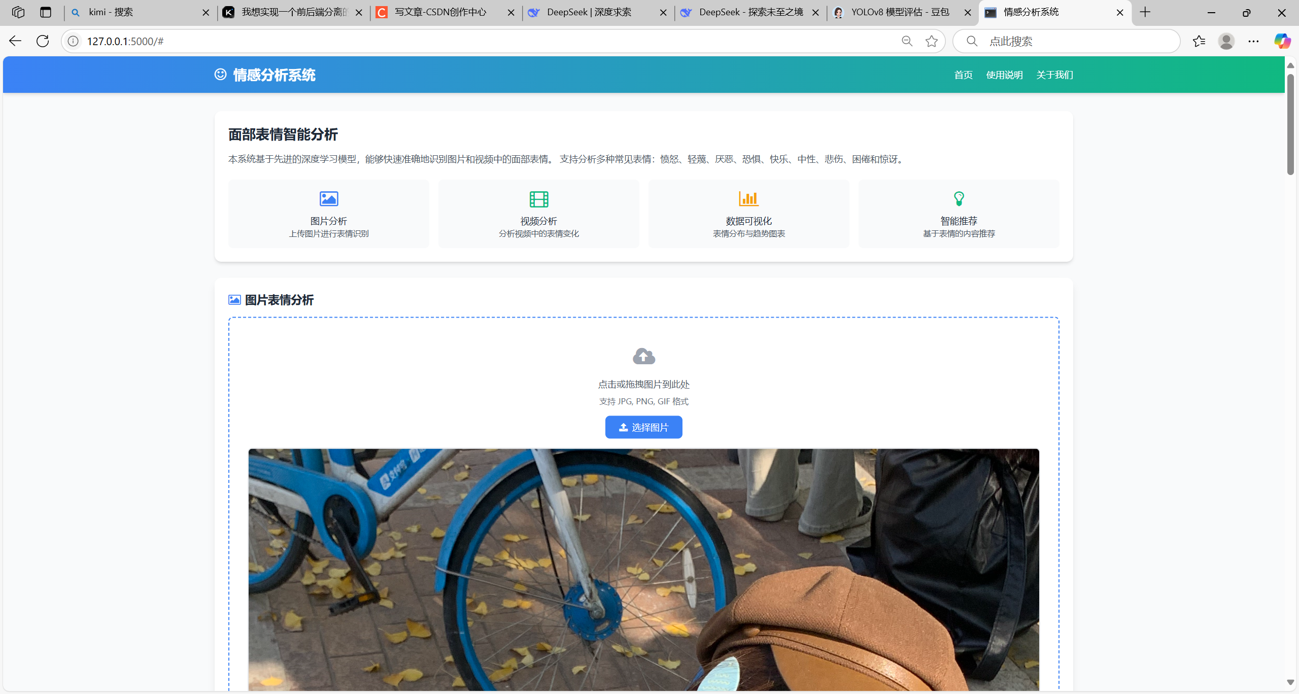 可以通过摄像头或视频文件进行表情检测。系统会在画面上实时标注人脸和识别出的表情,并提供统计信息和推荐内容。