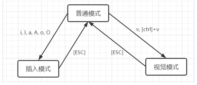 Vim 有多种模式,最常用的是:普通(命令)模式、插入(编辑)模式和视图模式。这些模式之间可以相互转换,如下图所示: