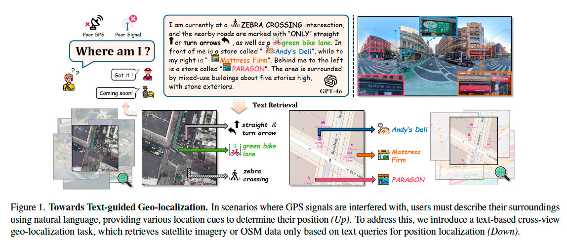 跨视角地理定位(Cross-view Geo-localization)旨在通过匹配街景图像与带有地理标签的卫星图像或开放街图(OSM)来确定街景图像的位置。然而,当前大多数研究集中在图像到图像的检索任务上,较少关注文本引导的检索,而后者对于如行人导航、紧急响应等应用场景具有重要意义。