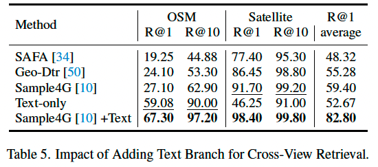 我们在 CVG-Text 纽约区域上开展了实验,结果如表 5 所示,新增文本分支后,卫星图检索 Top-1 召回率提升 6.7%,而 OSM 图检索 Top-1 召回率提升高达 40.2%,大幅增强了检索精度。这说明文本描述与 OSM 中的 POI 数据具有高度语义一致性,使得 OSM 检索受益更多。