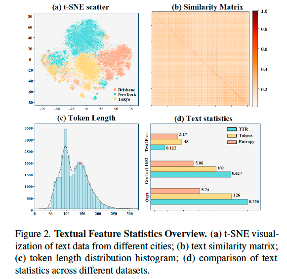 文本数据统计概览: 图 2 展示了场景文本的统计特征。t-SNE 降维可视化显示文本数据分布离散性强,反映出高多样性。同一城市的文本聚类明显,不同城市之间则表现出显著区分性,表明文本特征存在地域风格和文化特性差异。文本相似度矩阵显示整体相似度较低,进一步验证文本具备高度独立性,能够有效刻画场景并避免混淆。多模态大模型 GPT-4o 生成的平均文本长度超过 126 个 token,分布峰值在 100 与 145 之间,分别对应单视角图像与全景图像。与 Text2Pose 与 GeoText-1652 等数据集相比,CVG-Text 在词汇丰富度、token 长度与信息熵方面表现更优,显示出更高文本质量。