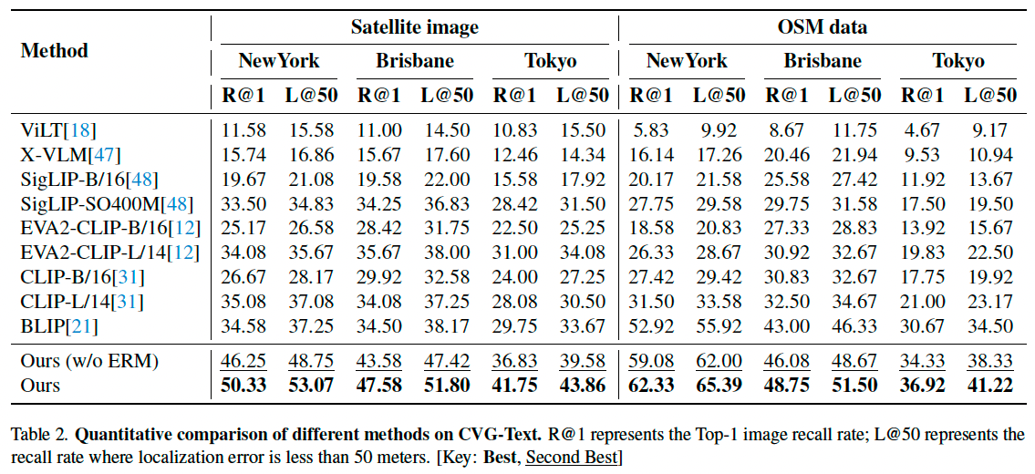评估指标。 我们采用前人工作 [10, 34] 中常用的 Top-K 图像召回率(Recall@K)作为评估指标。当某条查询文本对应的真实 OSM 或卫星图像出现在 Top-K 检索结果中时,判定为“定位成功”。此外,我们还引入了“地理定位召回率” [20, 42],即被检索结果与真实位置间的地理距离低于某一阈值的比例。
