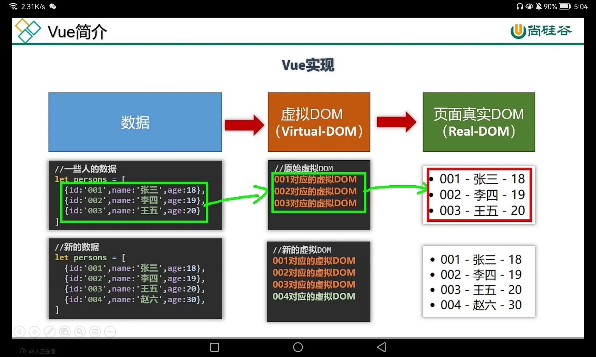 Vue实现,依旧存在的东西依然保持不变,只增加新增的东西,提高了复用率(在JS课程里面也讲过新增部分和替换全部旧的东西的课程)