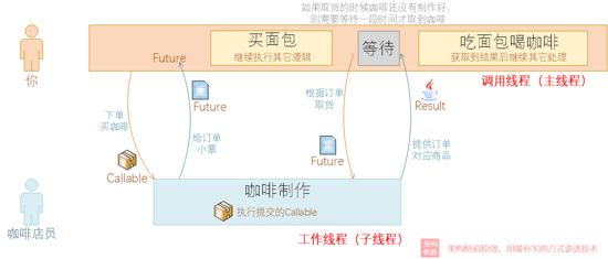 是不是很熟悉的生活场景? 对比到我们多线程异步编程的场景中,咖啡店的订单小票其实就是Future,通过Future可以让稍后适当的时候可以获取到对应的异步执行线程中的执行结果。