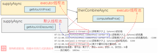 对上述代码实现策略的解读,以及与执行结果的关系展示如下图所示,可以看出,没有指定自定义线程池的supplyAsync方法,其使用了默认的 ForkJoinPool 工作线程来运行,而另外两个指定了自定义线程池的方法,则使用了自定义线程池来执行。