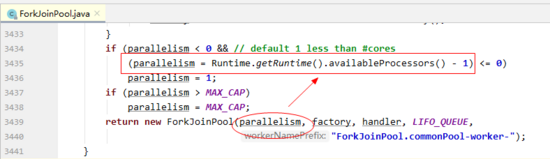 上面是Async结尾方法默认使用的ForkJoinPool创建的逻辑,这里可以看出,默认的线程池中的工作线程数是 CPU核数 - 1 ,并且指定了默认的丢弃策略等,这就是一个主要关键点。