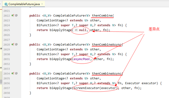 我们在使用 CompletableFuture 的时候会发现,有很多的方法,都会同时有两个以 Async 命名结尾的方法版本。以前面我们用的比较多的 thenCombine 方法为例: