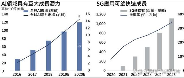 在物联网渗透率不断提高下,人工智能(AI)、第5代行动通讯(5G)、云端运算、工业自动化、智能汽车和数据分析的需求都在推动半导体行业的成长(下图左)。