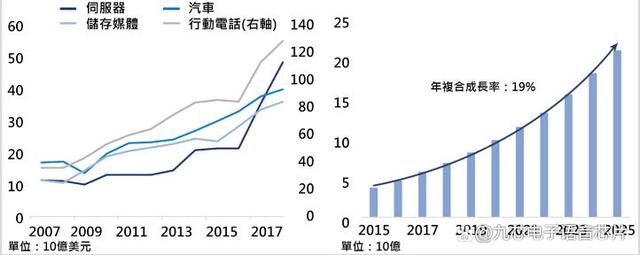 加上物联网需求长期可望稳定成长(上图右),势必进一步增加对数据储存和处理能力的需求,加强半导体生态系统的成长。