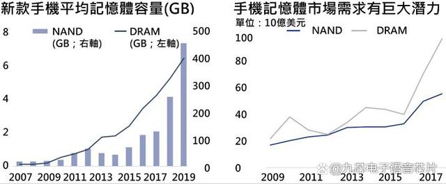 随着设备变得越来越复杂,手机存储器密度的增加已成为赢得这场战争的基本要素。顶级品牌的新手机每年都扩充DRAM和 NAND的使用量(下图左)。同时,智能型手机存储器的潜在市场于2018年攀升到1,600亿美元(下图右)。随着智能型手机配备更大的存储器密度,其他消费电子产品也安装更智能的功能,这都将带动处理器和存储器芯片需求的惊人成长。