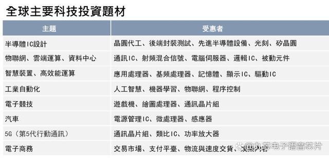 现在的世界越来越以数据驱动、更加重视整合与相互联结,全球投资人多数乐观看待半导体产业的投资前景,预期半导体相关技术可望持续进步,并应用于各产业发展(如下表)。