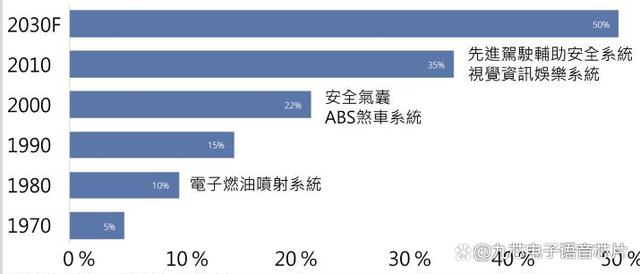 汽车工业的重心已经从单纯制造发展到安装、整合各式电子零组件,借以提升性能、效率、安全性和舒适性。目前的汽车创新主要由电子功能驱动,而不是机械驱动。在80年代,电子零组件仅占汽车制造总成本10%;如今,每辆汽车的电子零组件总成本已上升至约40%;随着汽车制造商争相加入更复杂的零组件和功能,预计到2030年占比将达50% (如下图)。