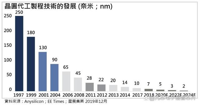 然而,仅有IC设计技术进步是不够的,晶圆代工厂和IC设计公司的密切合作才能带动整体产业持续创新。90年代中期以来,晶圆代工技术持续突破,晶圆中IC芯片的电路间隙一直在缩小,从1997年的250奈米(nm;十亿分之一公尺)一路缩小到目前最新的7~10奈米制程技术(如下图)。当电路间隙缩小,一个芯片中就能包含更多的晶体管,不仅能消耗较少的电力,还能提供更多功能,芯片的处理速度也会更快。