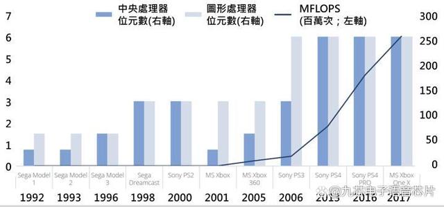 游戏正逐渐成为一种主流爱好,且新游戏以惊人的速度推出。过去20年中,游戏机处理器经历惊人的发展。2005年以来,中央和图形处理器(CPU和GPU)已从50位元大幅成长至250位元以上,而MFLOPS(每秒浮点运算百万次)已增长了五倍,达到6M(如下图)。正是IC芯片设计和晶圆代工技术的不断进步促进了上述这些发展。