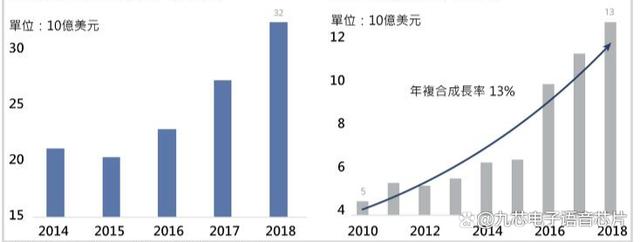 2014年以来,全球轿车的年销量一直维持于6,500~7,000万辆,且未来数年整体销量仍可能持平。尽管如此,电子零组件的应用发展仍带动车内半导体组件使用量激增,车用IC的整体潜在市场近年已明显扩大(下图左);世界一流的IC设计公司在汽车芯片的收入也呈现大幅成长(下图右)。