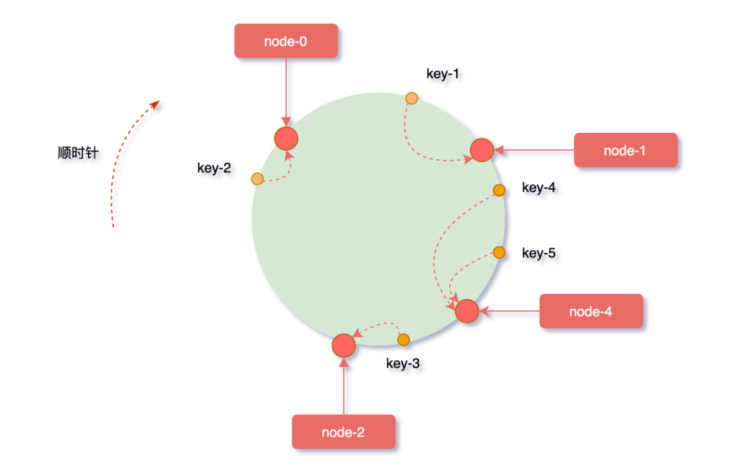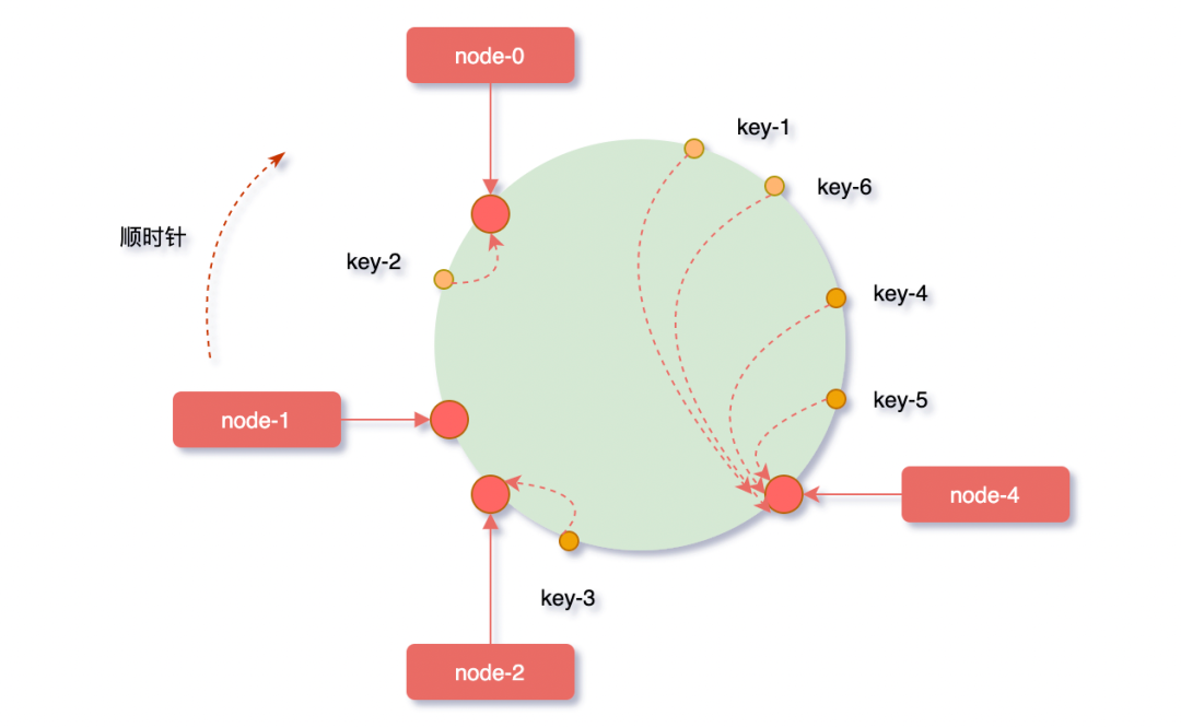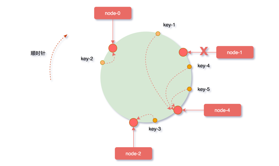 反之,假如node-1节点宕机,沿顺时针方向对象映射节点,缓存在node-1上的对象key-1被重新映射到了node-4上,此时受影响的数据只有node-0和node-1之间的一小部分数据。