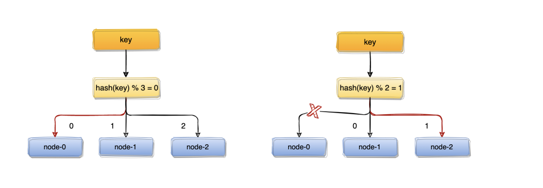 比如:一个服务器节点挂了,计算公式从hash(key)% 3变成了hash(key)% 2,结果会发生变化,此时想要访问一个key,这个key的缓存位置大概率会发生改变,那么之前缓存key的数据也会失去作用与意义。