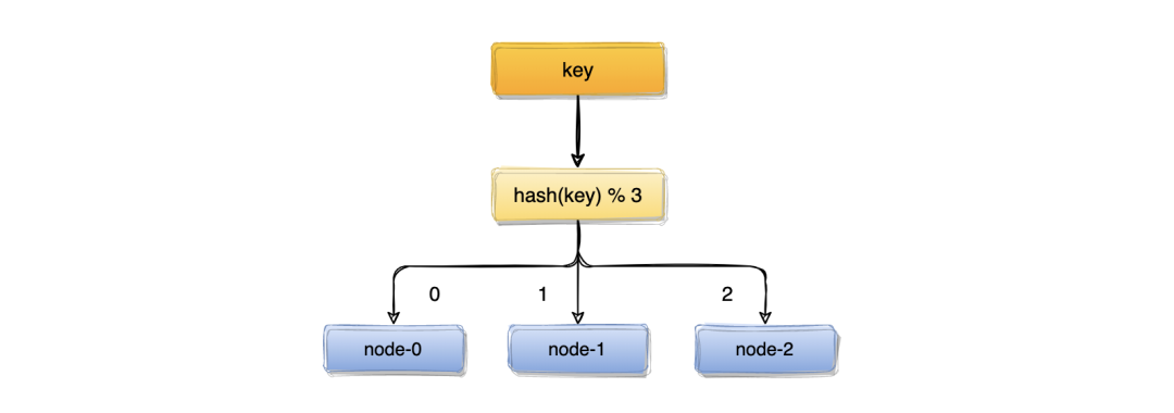 我们可能首先想到的方案,是取模算法hash(key)% N,对key进行hash运算后取模,N是机器的数量。key进行hash后的结果对3取模,得到的结果一定是0、1或者2,正好对应服务器node0、node1、node2,存取数据直接找对应的服务器即可,简单粗暴,完全可以解决上述的问题。