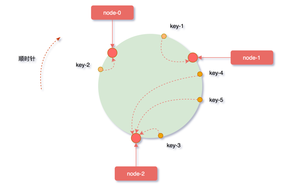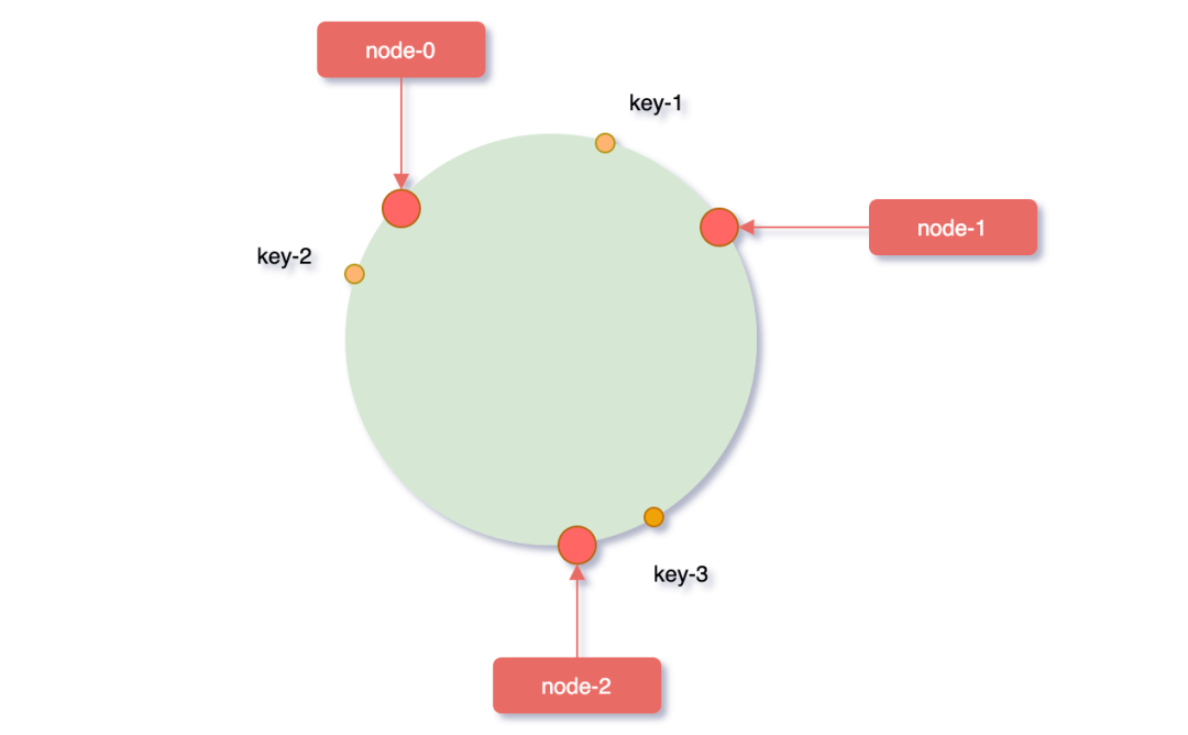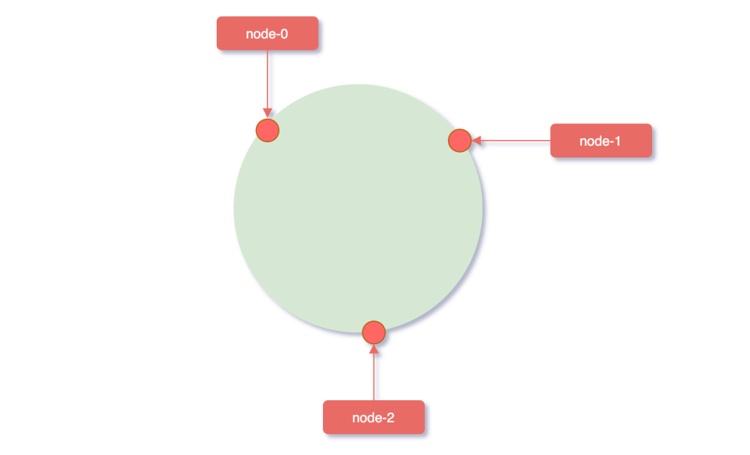 那么这个hash环和一致性hash算法又有什么关系嘞?我们还是以上边的场景为例,三台缓存服务器编号node0、node1、node2,3000万个key。