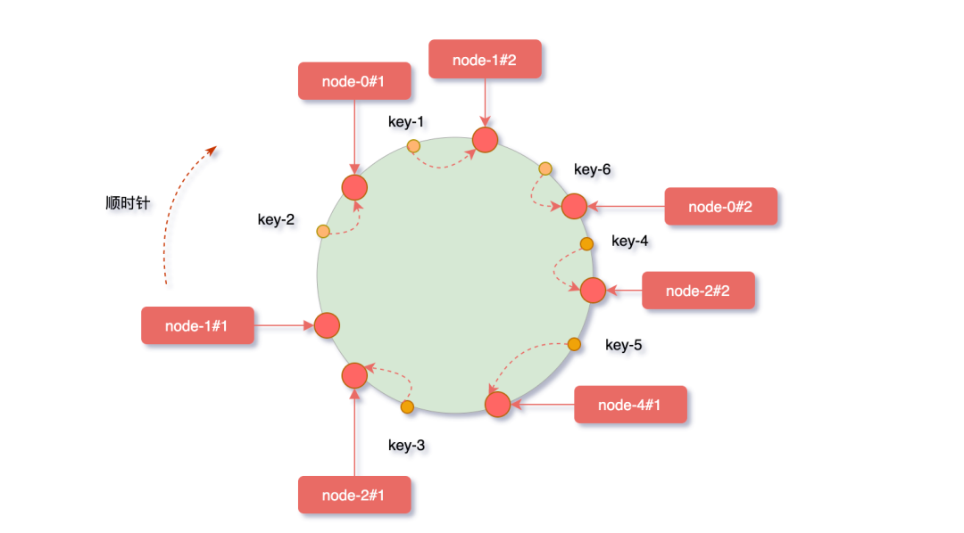 虚拟节点的hash计算通常可以采用,对应节点的IP地址加数字编号后缀 hash(10.24.23.227#1) 的方式,举个例子,node-1节点IP为10.24.23.227,正常计算node-1的hash值。