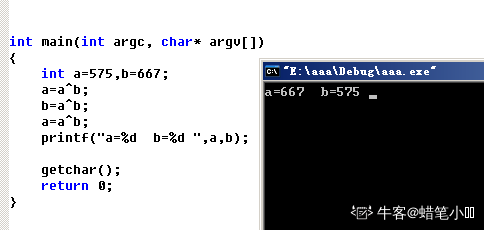 int main(int argc, char* argv[]) { int a=575,b=667; a=a^b; b=a^b; a=a^b; printf("a=%d b=%d \n",a,b); getchar(); return 0; } |
