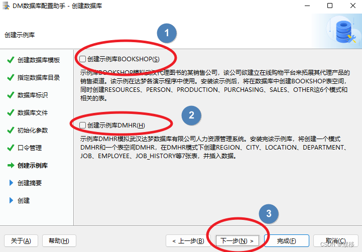 9.此处为创建示例库,建议勾选创建示例库 BOOKSHOP 或 DMHR,作为测试环境。