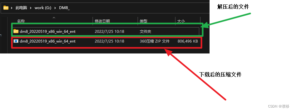 1.本次安装是在win11平台上进行操作。下载完成后,去相应的文件夹找到下载文件(dm8_20220519_x86_win_64_ent.zip),将其解压缩至目标文件夹,这里我解压到了当前文件夹。