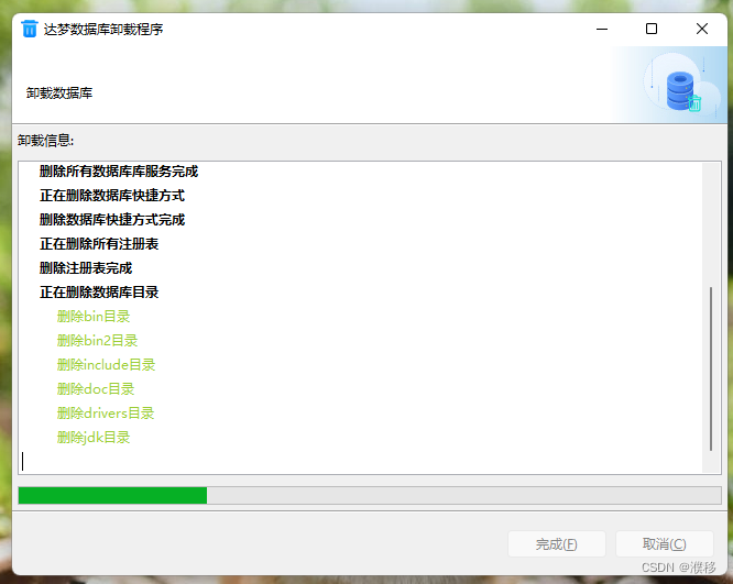 点击“确定以后”,会自动进行卸载并显示卸载进度。卸载完成后,点击“完成”。