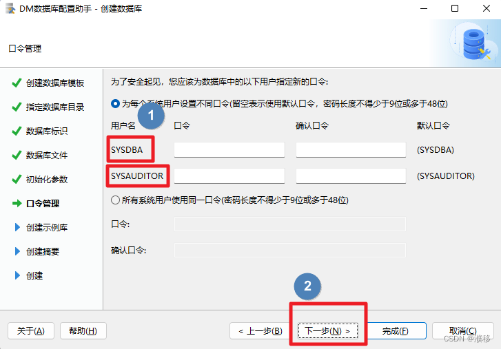 8.此处为口令设置。如果选择默认设置,则口令与登录名一致。如果需要修改,在SYSDBA和SYSAUDITOR右面的方框中输入口令即可。设置完成后点击下一步。