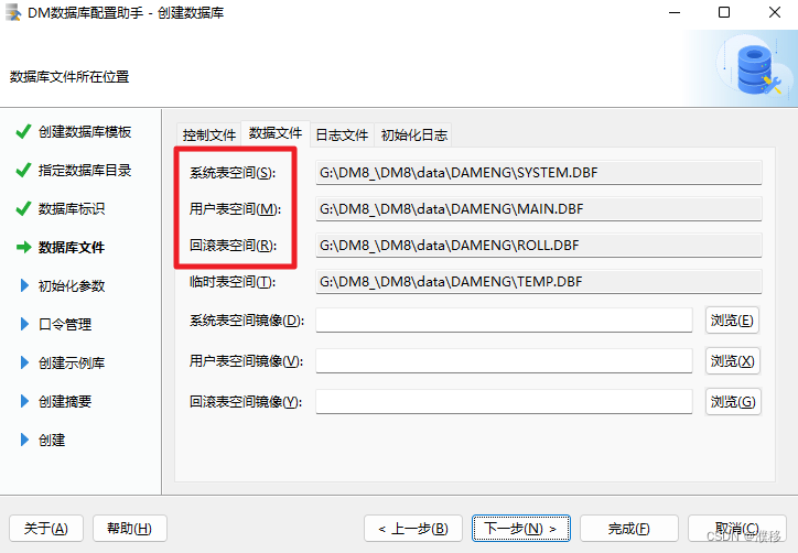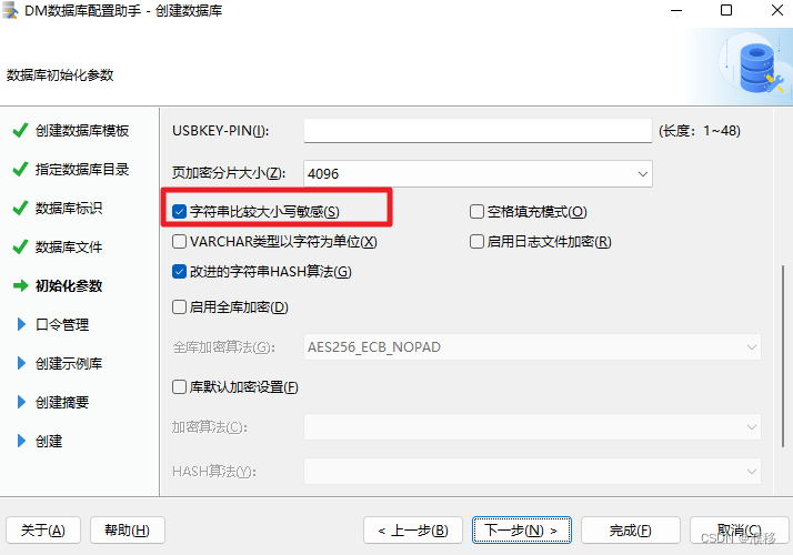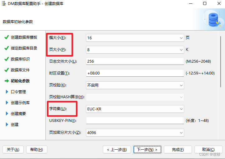 7.此页是设置数据库的初始化参数,包括簇大小,页大小,字符集,日志文件大小等,建议选择默认设置即可。如需修改,可以参考以下常见参数说明。