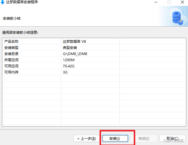 9.查看安装前小结信息,包括产品名称,安装类型,安装目录,所需空间,可用空间,可用内存,确认无误后,点击“安装”。