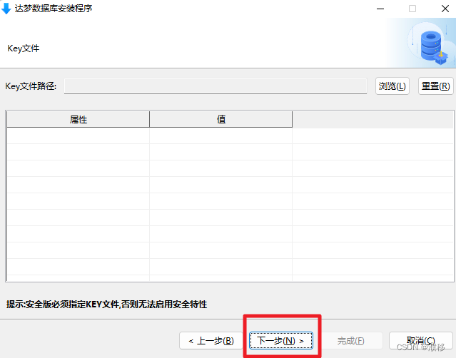 6.此步骤可以跳过,如果没有 Key 文件,点击“下一步”即可。如有则点击“浏览”按钮,选取 Key 文件,安装程序将自动验证 Key 文件合法性,点击“下一步”继续安装。