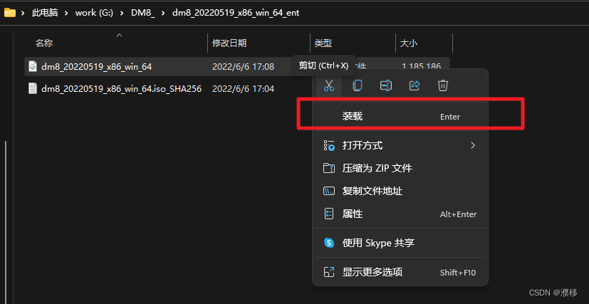 2.在此文件夹中找到dm8_20220519_x86_win_64光盘映像文件,点击鼠标右键进行装载。