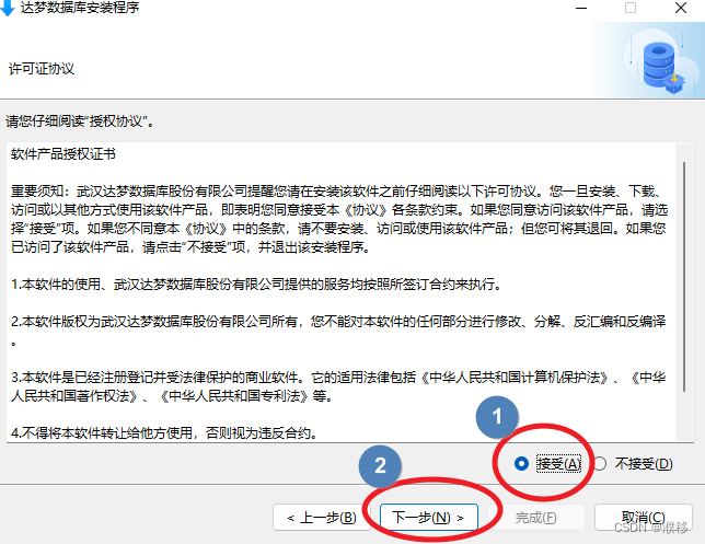 5.查看达梦许可证协议,点击“接受”,然后点击“下一步”。