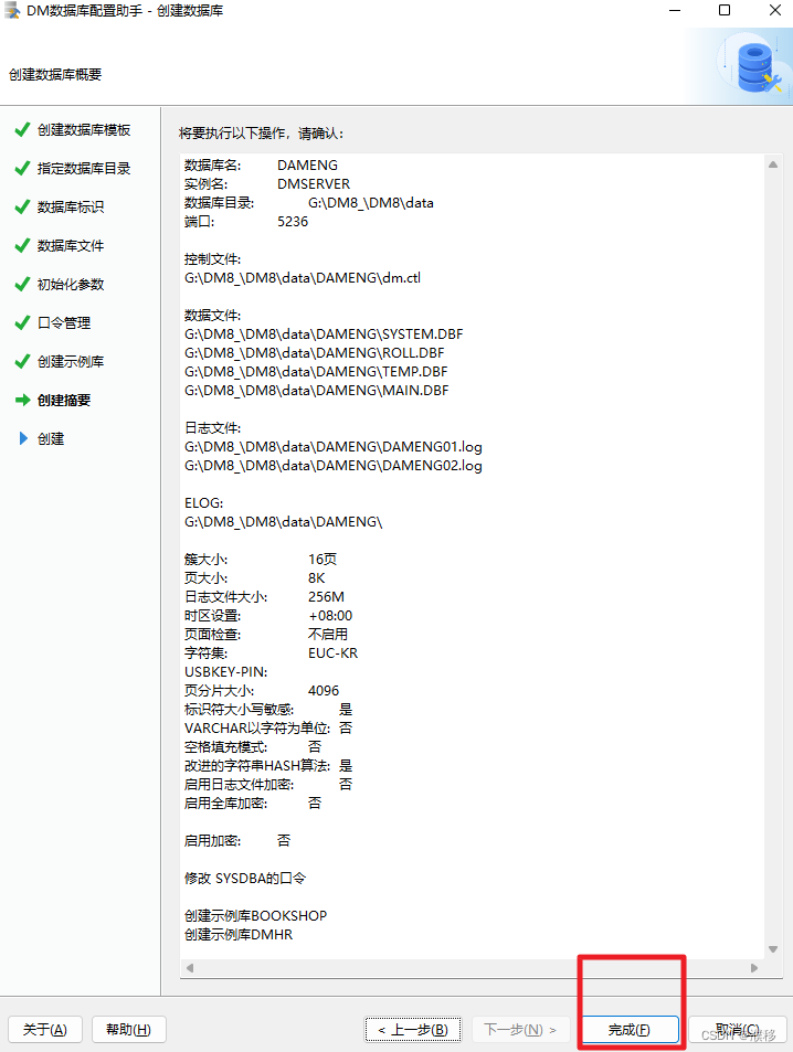 10.在数据库开始安装之前,在此页显示我们通过数据库配置工具设置的相关参数。确认无误后点击“完成”,进行数据库实例的初始化
